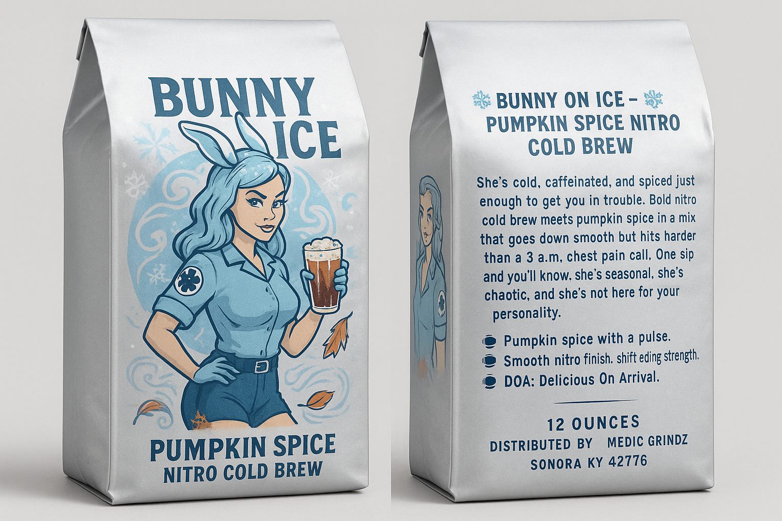 She's cold, caffeinated, and spiced just enough to get you in trouble. Bold nitro cold brew meets pumpkin spice in a mix that goes down smooth but hits harder than a 3 a.m, chest pain call, One sip and you'll know. she's seasonal, she's chaotic, and she's not here for your personality.